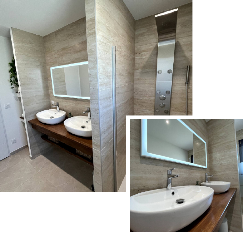 La Dolce Rhôna offre 2 salles de bains, chacune équipée de doubles vasques, d’une douche, de rangements et d’un sèche- cheveux. Pour plus de confort, 2 toilettes séparés sont également à disposition.